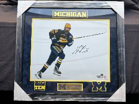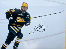 This framed, autographed photo of Adam Fantilli from the University of Michigan captures the standout hockey star in action. Now, he is a center piece of the NHL's Columbus Blue Jackets.