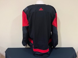 Authentic made in Canada Stadium Series jersey signed by captains Jordan Staal #11, Sebastian Aho #20, Jordan Martinook #48, and Jaccob Slavin #74. Size 58.