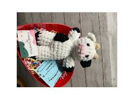 Handmade crochet Cow Plushie made by local artisan, Stitched By Stephanie. This Cow includes a "Certificate of Adoption" for the winner.