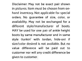 No guarantee of size, color or style availability. Must be chosen from on-hand inventory-not applicable for special orders. May not be exchanged for a different style/manufacturer of boots. May be used for one pair of ankle height boots by same manufacturer and in same style (Junkin' with Jordan, hide-on) if size/color desired not available but no value difference will be paid out to customer nor will any credit for difference be given to customer.