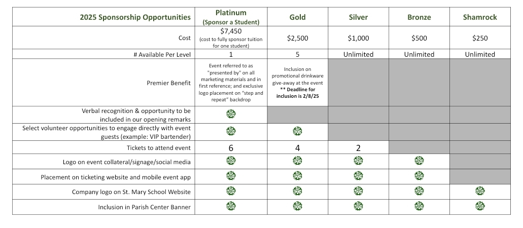 Sponsoring the St. Patrick's Day Party is a powerful way to associate your brand with an exceptional organization - and one that continues to achieve the highest academic outcomes. For this year's party we anticipate more than 400 guests. As a sponsor, you will gain unique and valuable exposure to the St. Mary School community while sending a strong message to your customers, clients and employees that you care about the academic, social and emotional health of our most valuable asset - our children. Thank you for your consideration.