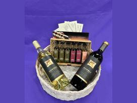 Calling all foodies! Take home this gorgeous, artisan-crafted charcuterie board. From Sheboygan, WI, it's made of locally-harvested cherry (right side) and maple (left side) with a natural edge. The beauty of this one-of-kind piece is enhanced with a heartfelt inscription. Finished with a food grade mineral oil, this will be a centerpiece for any gathering. Two bottles of wine included.