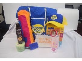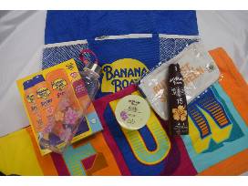 - A beach bag full goodies including a beach towel, Banana Boat sunscreen & hat, Hawaiian Tropics body butter, makeup bag and water bottle.
