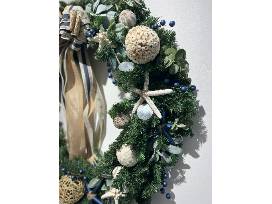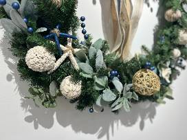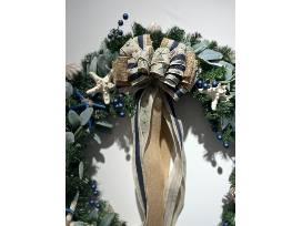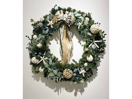 This charming wreath is sure to make all of your Coastal Christmas dreams come true! Between the custom painted starfish, coastal ornaments and Capiz shells, you can almost hear the ocean break to the tune of Jingle Bells!