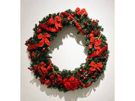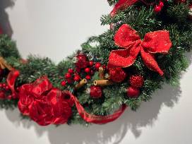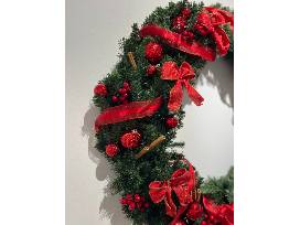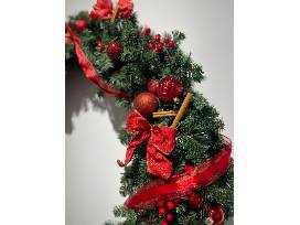 Your season will be complete with this zesty festive wreath hanging on your front door. Decorated with glistening red ornaments, faux red winterberries, spicy cinnamon sticks, red and gold bows along with a satin and organza ribbon that swirls the lush evergreen wreath. Wishing you a "Berry Cina-mas" and Happy Holidays.