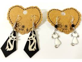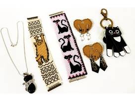 Pounce on this package and show your love for cats with two, 2" x 7" hand beaded cat bracelets, two pairs of handmade cat themed earrings, a 17" silver chain with a 2" black cat pendant and a Fossil, black and white, 3" x 0.5" x 1.5" Sofia Cat Key fob.