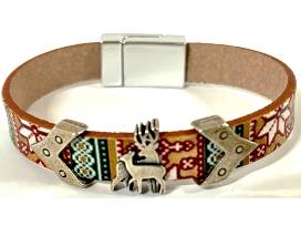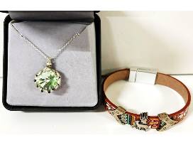 Upgrade your winter wardrobe with this beautiful 16" green crystal pendant on a silver chain & a 7" leather cuff bracelet with magnetic clasp with reindeer embellishments.
