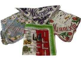 Whether you are a collector or just love the beautiful designs, these state souvenir handkerchiefs are a conversation starter! The collection includes an 11" x 11" Illinois hanky, a 13" x 13" Wisconsin hanky, a 13" x 13" Virginia hanky and a 13" x 13" Minnesota hankie.
