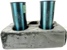Keep your couch in pristine condition with this 13" x 8" x 4" couch cup holder pillow in gray with an anti-slip base and removable cover for cleaning. It also works great for the bed, RV or car and comes with two, 16 oz. Starbucks stainless steel cups.