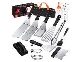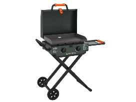 The Blackstone 22-inch on-the-go griddle is the perfect portable cooking companion for any meal with collapsible capabilities. It features two distinct cooking areas, as well as two spatulas, one scraper, one pair of tongs, a 12-inch basting cover, a basting brush, two 32-oz condiment bottles, an apron, a handle with ten scour pads, two seasonings, and a pair of Blackstone griddle gloves to assist you with your cooking and cleaning tasks.