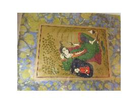 This miniature of a girl daydreaming was painted by a young Uzbek woman studying ancient miniature painting techniques from an internationally recognized Uzbek artist, Davlat Toshev in Bukhara, Uzbekistan. It is on recycled paper also produced at the studio, and the background border displays oil painting techniques from the 14th century.