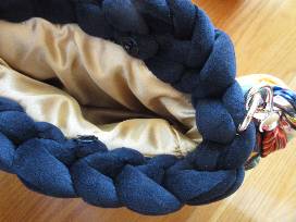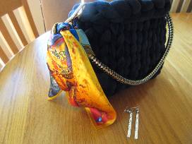 Black velvet yarn handbag with gold satin lining with braided gold and black strap accented by matching multi-colored scarf COMBINED with unique & elegant earrings: Simple hammered silver tone bar dangle earring with black pearl. Special thanks to Barbara Weisel.