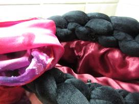 Black velvet yarn handbag with deep red satin lining with black and white acrylic handles accented by matching multi-colored AND chic earrings - Elegant sparkly gold ring earrings with white pearl drop.