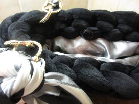 Black velvet yarn handbag with silver satin lining with black strap accented by matching multi-colored scarf ; along with TWO chic earring sets - Delicate sage green pearl and crystal earring; and silver tone featherlight tassel earrings.
