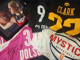 Natasha Cloud is a Guard and spend 8 amazing seasons playing for the Washington Mystics, giving it her all. Named twice to the All-Defensive 2nd team and once to All Defensive 1st Team. Cloud is now rocking it with the Phoenix Mercury. Center Stefanie Dolson started her career with the Chicago Sky for 5 seasons before moving to the New York Liberty for 2 seasons. She is now a force to be reckoned with after 4 seasons with the Mystics. This bundle includes an officially autographed Cloud Mystics jersey and Mystics basketball which is housed inside a commemorative case. It also has an official Dolson autographed Mystics jersey and t-shirt. This bundle also comes with a BONUS t-shirt featuring another famous and amazing guard - Caitlin Clark, of the Indiana Fever.