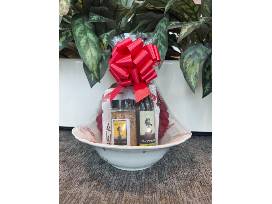 A crawfish serving bowl, a crawfish tea towel, a recycled wool/felt trivet, a full size Deep South Lagniappe Spice Blend and a Garlic Infused Olive Oil.