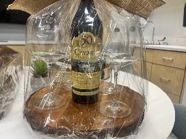 A 1 liter bottle of 50th anniversary Caymus 2022 Cabernet Sauvignon, 4 red wine glasses, and a decorative board.
