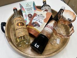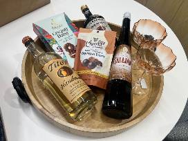 A bottle of Galliano Espresso liqueur, a bottle of Tito's vodka, flavored syrup, a gorgeous wooden tray, glassware, and decadent snacks to complement your martinis!
