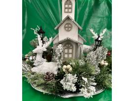 A charming white chapel surrounded by frosted greenery, delicate reindeer, and subtle silver and white accents. Ideal for creating a rustic winter wonderland vibe.
