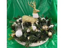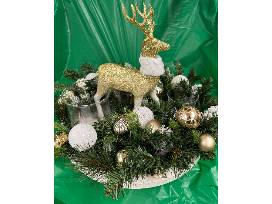 A glamorous golden reindeer centerpiece surrounded by frosted greenery and golden ornaments, perfect for adding sparkle to holiday decor.