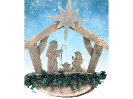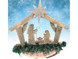 A handcrafted wooden nativity scene set in a lush greenery wreath, beautifully celebrating the true meaning of Christmas.