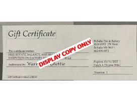Certificate for Rotate, Balance, & Brake Inspection on Factory Equipment Vehicle