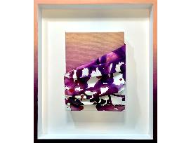 12.5"W x 14.5"H, Mixed media on paper, canvas board, white wood frame with painted detail. Wire hang.