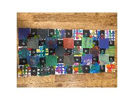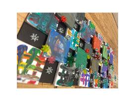 Ms. Baird's 3rd grade class created this colorful art piece using painted mini canvases and plastic snowflakes. Each student added their own design to make a fun and creative group project.