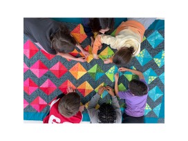 Own a priceless treasure to remember your time at Lafayette! Every Lafayette 5th grader has sewn a patch in vibrant bright colors against a swirly dark "sky" background. Our squares have then been machine sewed together by dedicated 5th graders during their lunch and recess. Signed on the back and hand tied with embroidery floss by Lafayette 5th graders, you won't want to miss bidding on this gorgeous and unique memento!