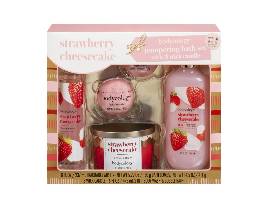 Treat yourself or a loved one to the gift of relaxation with this personal care gift set, which features the Bodycology Strawberry Cheesecake Pampering Bath Set with 3-Wick Candle. It includes: