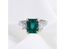 This stunning ring is set in platinum and 18k yellow gold, featuring a 4.57ct emerald at the center accented by two brilliant emerald-cut diamonds totalling 0.81ct. Includes a complimentary ring sizing at Diamonds Direct. No returns or exchanges.