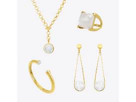 Suite of jewelry (necklace, earrings, ring, and cuff) featuring brilliant-cut rainbow moonstones. Dean Davidson jewelry is constructed with just as much passion and attention to detail as it is conceptualized. Every piece is meticulously handcrafted and made from the highest quality materials, with a warranty that promises a lifetime of wear. No returns or exchanges.