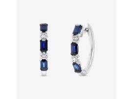 Uneek Precious Collection's emerald cut blue sapphire huggie earrings are a timeless gift. Featuring six sapphires totaling 2cts and four round diamonds at .45cts, they're crafted with elegance and a polished finish, perfect for celebrating love with lasting beauty. No returns or exchanges.
