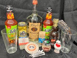 Shake up the perfect Zing Zang spicy bloody mary with a large bottle of Tito's, 3 drinking glasses, olives, and bamboo picks for a polished presentation.