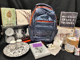 Indulge in style and charm with this delightful collection featuring Kendra Scott earrings, a $25 Gourmet Gift Basket certificate, a Lug backpack, a Michael Kors necklace and earring set, a floral puzzle, tic-tac-toe games, decorative artwork, amethyst ornament, a sauce server, and an artisan-crafted matching salt and pepper shaker set with a coordinating plate.