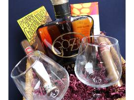 Unwind with a bottle of Gozio Amaretto, gourmet chocolates, the creamy-smooth flavors of 2 Romeo y Julieta cigars, and a stylish set of rocks glasses-perfect for a cozy night in.