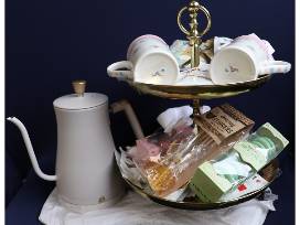 Treat yourself to a delightful tea experience for 2 with assorted teas, charming honey stirrers, tea cups, cloth napkins with rings, and a tiered tea tray to display a sweet array of tasty macarons. Boil water instantly in a "Beautiful" electric kettle by Drew Barrymore.