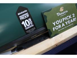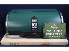 Enjoy a year of You Pick Two meals once a month from Panera Bread, along with a coveted 15" x 20" Boos Board, forest green breadbox, and bread knife.