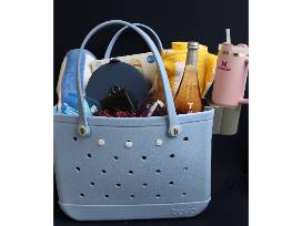 You're shore to rock the beach with a trendy Bogg Bag, cup holder, and Stanley tumbler. Pack a snack in a stylish blue Porter salad container and have a picnic with 2 beach towels, non-alcoholic sparking rose, and stemless wine glasses, or get competitive with an inflatable corn hole game for extra fun in the sun!