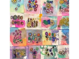 The kindergarten students became experts at drawing beautiful flowers this year in the art room so we decided to make some shrinky dinks. The artists loved watching the flowers shrinking in the toaster oven. They created beautiful backgrounds using tissue paper and water to stain the watercolor paper. This colorful and original piece of art is full of cheer just like the young artists.