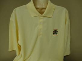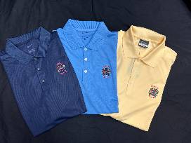 1Three men's, size Large, Carnival Memphis Golf Shirts in Light Blue, Yellow, and Navy Blue.