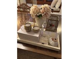 0This beautiful Interior Design gift basket includes: 1 white vintage vase, debossed stone ware footed planter, 19" Paremont lantern, 2 La Fete Golden Decal charm p. flutes, 2 Aureus filled with candles, 25" Paramount Lantern, Bone Tray, 2 Hydrangea morning stems, Bone Coasters, $500 Summer House Gift Card, a Suzanne Kasler book, and a Valentina Ball Diffuser