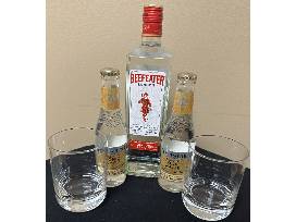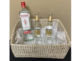 This basket includes two glasses, two tonics, and a bottle of Gin