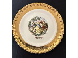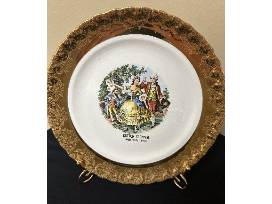 This is a mid-century Cotton Carnival Plate. Manhattan Ware plate with courting scene, 22 karat gold plated with gold display stand