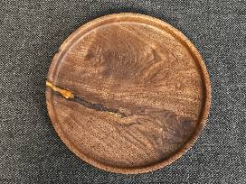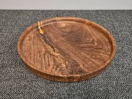 Crafted from rich walnut wood, this striking platter features a flowing gold epoxy accent that adds a touch of modern elegance to its natural beauty. The surface showcases a warm mosaic of browns-from light caramel to deep chocolate-enhanced by the wood's intricate grain patterns. Measuring 14.5" in diameter and 1.5" deep, it's perfect as a serving piece, centerpiece, or decorative accent.