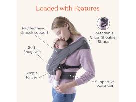 This newborn carrier is made of soft, comfy knit fabric that will gently cradle your newborn from day one. It provides three carrying modes to keep baby close as they grow (newborn, baby facing in, and baby facing out). Best of all, it is even comfortable for you with no complicated wrapping or tying. It is ideal for beginners with easy buckling and only three clicks to secure. The supportive waist belt distributes baby's weight evenly and the adjustable cross shoulder straps provide a comfortable fit for a wide range of bodies. When not in use, it rolls up for easy storage in a diaper bag or underneath the stroller.