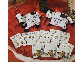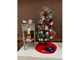 A simply decorated tree with a gift basket of Chick-fil-A goodies! It includes a beanie, two pens, a journal, a mug, a pickle keychain ... and much more.