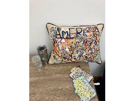 Assortment of cat studio art and products, including a pillow and thermos.