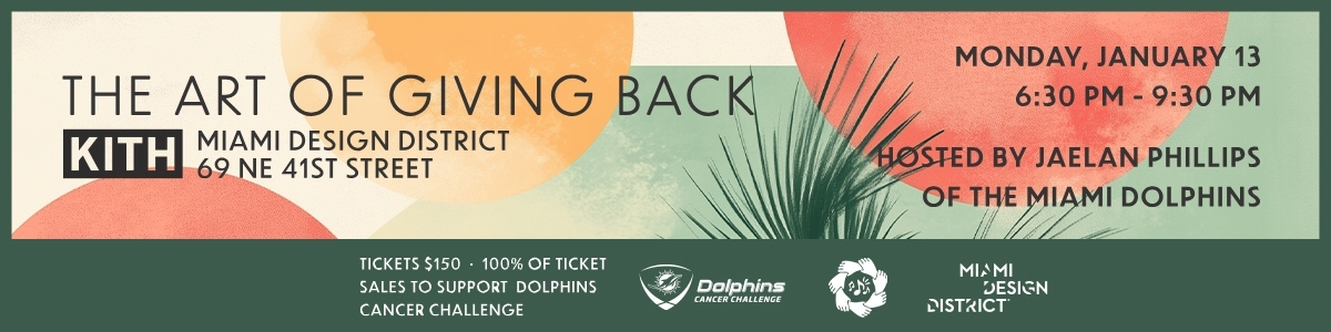 Jaelan Phillips of the Miami Dolphins is teaming up with KITH to host the annual Art of Giving Back charity event benefiting Dolphins Cancer Challenge in support of Sylvester Comprehensive Cancer Center. Joined by Jaelan's Miami Dolphins teammates, this exclusive event will feature an artistic display of fashion, music, and philanthropy. Enjoy bites by Sadelle's and Kith treats limited edition "The Campfire" ice cream by Jaelan Phillips.