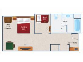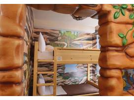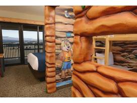 Kids and parents alike love staying in the Wolf Den Suite. The suite includes built-in wolf's den-themed sleeping quarters. This Northwoods-themed sleeping area is furnished with bunk beds. The main living area features a queen bed and a twin-size sleeper sofa.